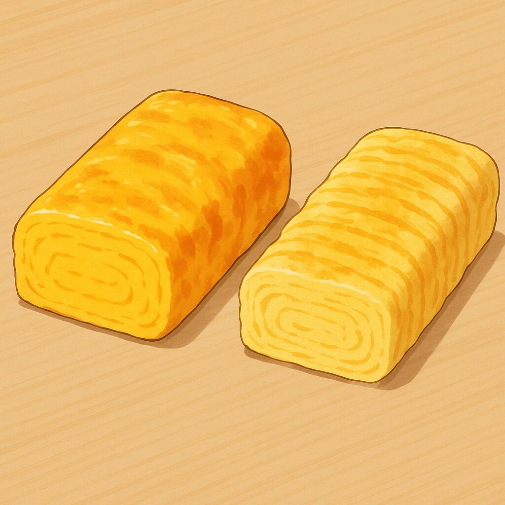まず色合いですが、卵焼きはやや濃いめの焼き色が付きやすく、きつね色の層がくっきりと出ることが多いです。