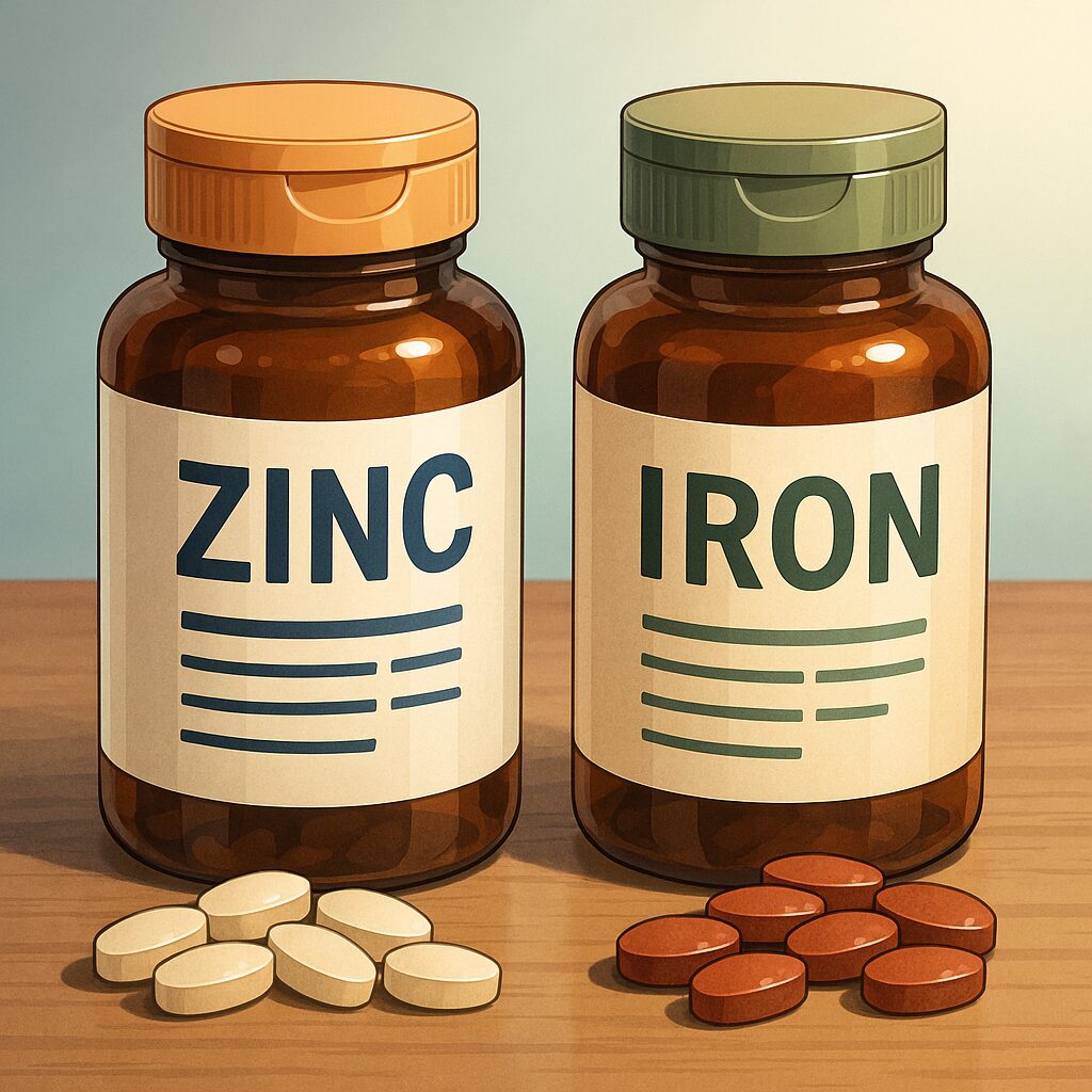 亜鉛と鉄は、どちらも小腸で吸収されるときに同じ経路を使うため、同時に摂ると吸収が競合することがあります。